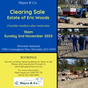 The sale will commence at 10am at the Silverdale Saleyards – 5380 Cunningham Hwy, Silverdale QLD 4309.