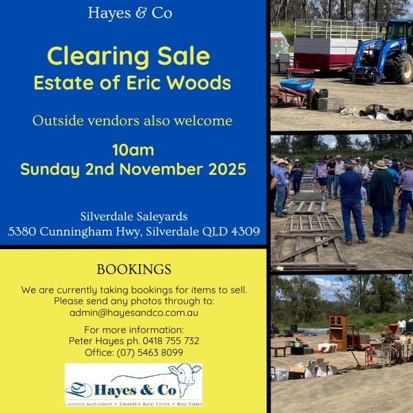 Clearing Sale - A/c Estate of Eric Woods Outside vendors welcome 10am, Sunday 2nd November 2025 Address - Silverdale Saleyards, 5380 Cunningham Hwy, Silverdale QLD 4307Hayes & Co, Silverdale will […]