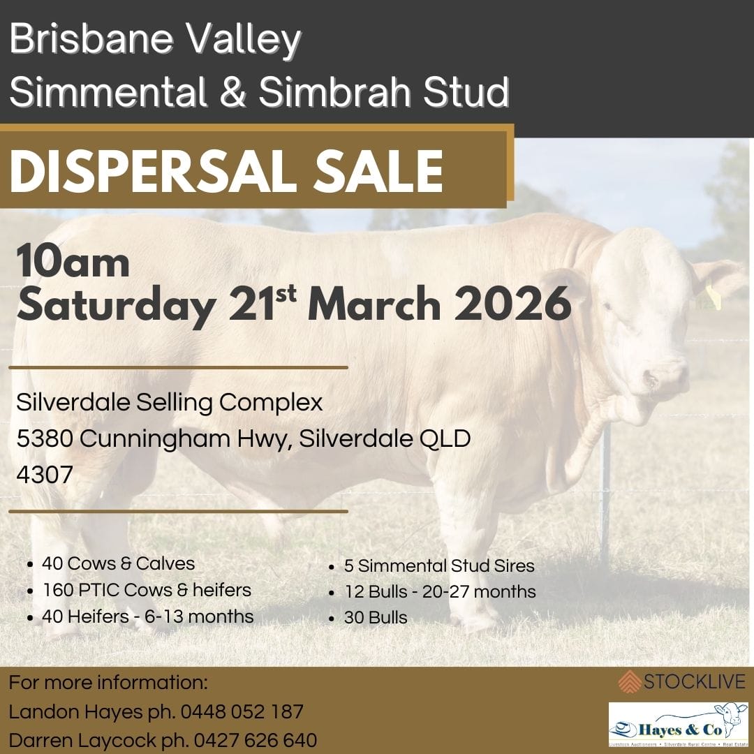 The Brisbane Valley Simmental & Simbrah Dispersal Sale will be held on Saturday 21st March 2026. The sale commences at 10am at the Silverdale Selling Complex. Don't miss the chance to buy some great genetics from over 30 years of breeding. On offer: 40 Cows & Calves 160 PTIC Cows & Heifers 40 Yearling & Weaner Heifers 30 Yearling Bulls 10 Working Bulls 5 Used Sires All Cattle are run in high tick & lantana country. Cattle will be pre-treated for ease of movement into tick free country. - Click here - To view the catalogue   Buyer Registration The […]