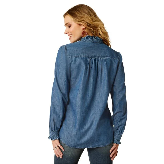 Romanticize your wardrobe with this pretty chambray shirt. Ruffle details bring femininity to the closet staple, without taking away from its trademark versatility.