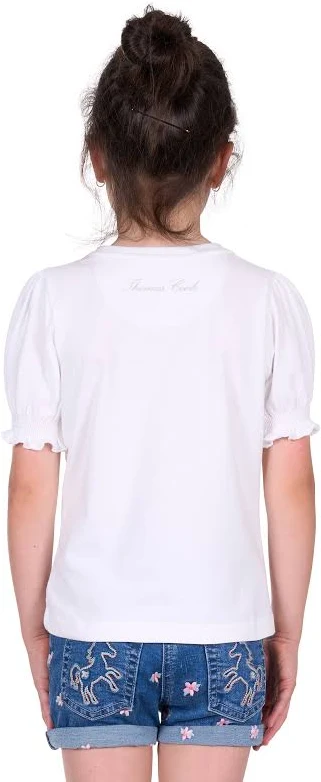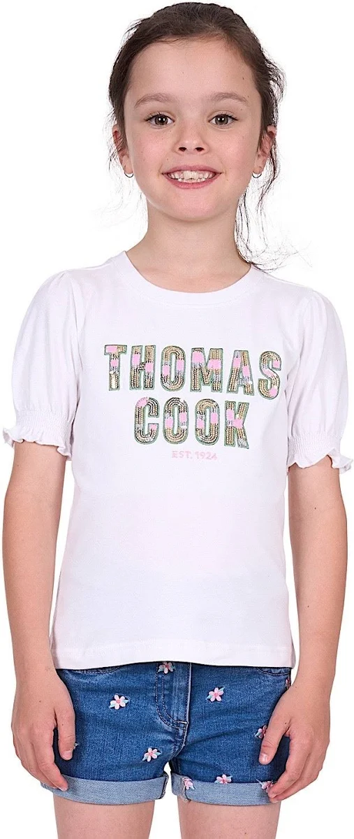 The Thomas Cook Girl’s Cleo Tee showcases a prominent embroidered design embellished with sequins on the front. It offers stretch fabric for ease of movement and comfort, complemented by elasticated, shirred sleeve hems with gentle gathers.