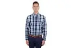 2-Pocket long sleeve shirt, one with pen holder, long shirt tail, back pleat for comfort and movement, concealed collar peak buttons, removable collar stays, horseman embroidery on chest pocket
