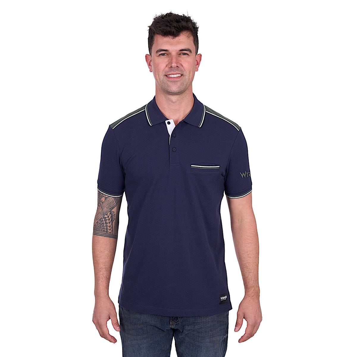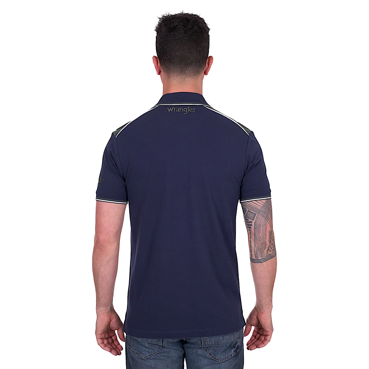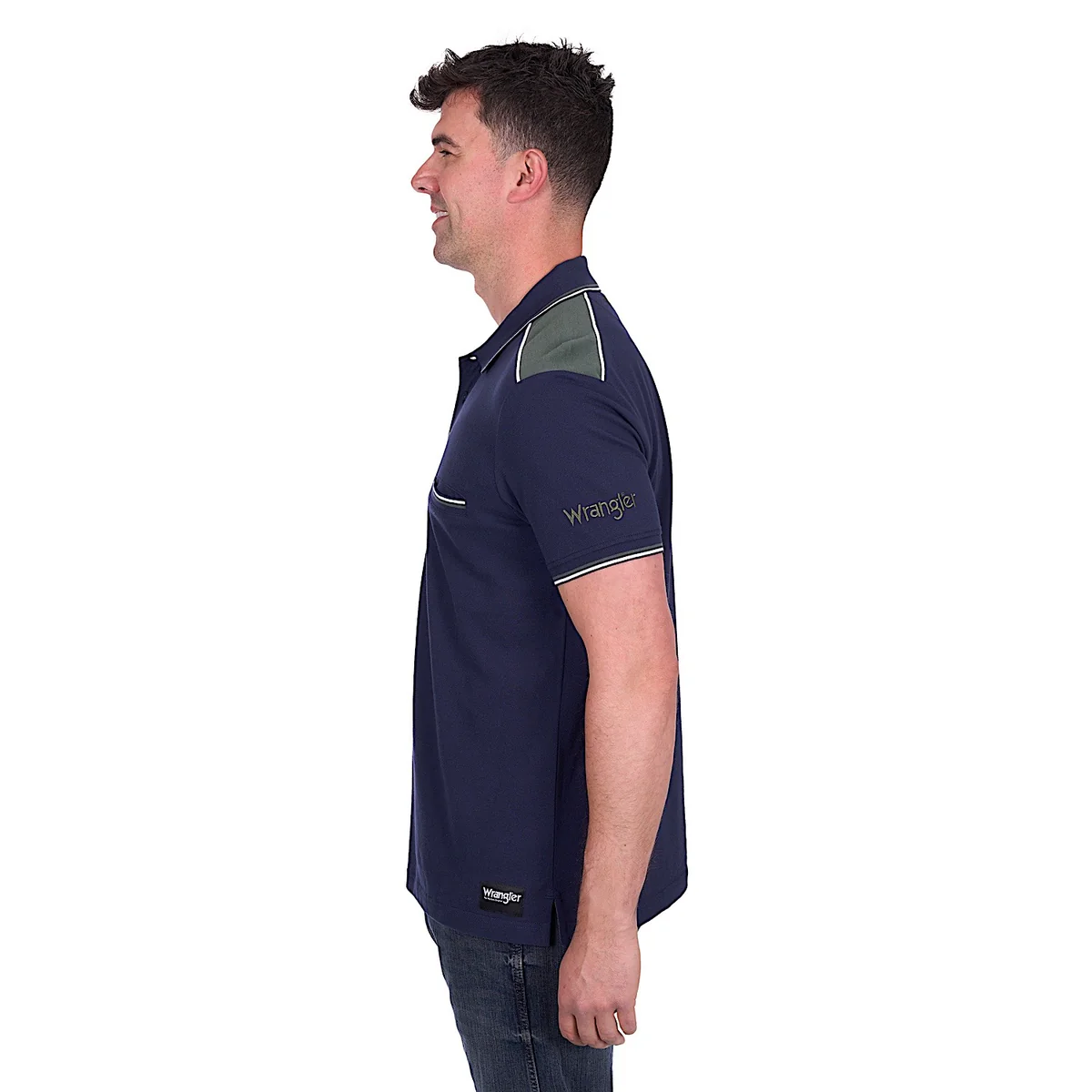 Classic polo shape, contrast shoulder panels with piping, rib trim (collar, sleeve cuffs and chest pocket) with contrast stripe tipping, premium quality herringbone taping on front placket, contrast herringbone taping on inner neck and side seam splits, Wrangler iconic logo hem label