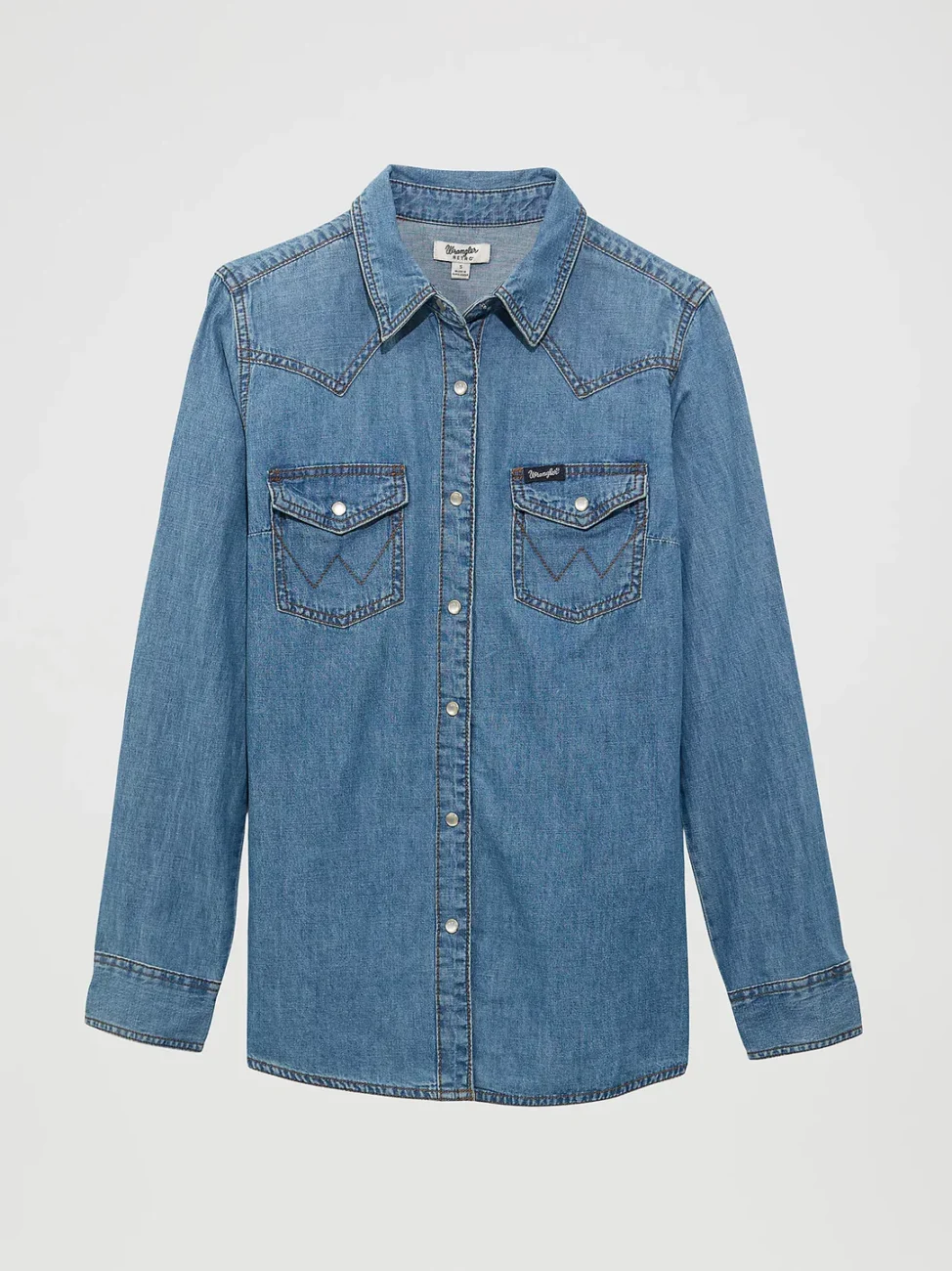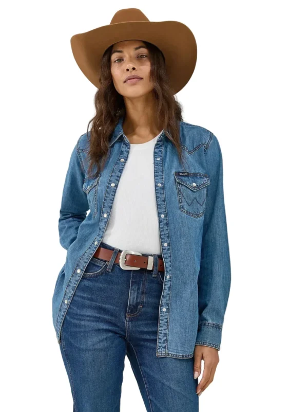 Classic western shirt in mid weight denim, snap closure, extra snap at bust, western pocket detail, western front and back yoke.