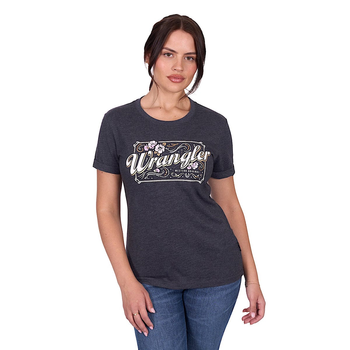 Classic tee shape, rib neck band,Wrangler logo pip on side seam.